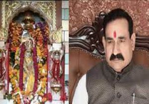 गृह मंत्री डॉ. मिश्रा बाइक चलाकर माँ पीतांबरा पीठ के दर्शन के करने पहुँचे