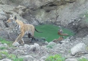 बाघिन शावकों को लेकर तालब के पास नजर आई