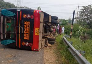 मजदूरों को लेकर जा रही बस अनियंत्रित होकर पलटी ,40 मजदूर घायल