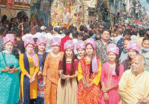फूलों से सजी सड़क पर निकलीं नगर सेठानी-जेठानी