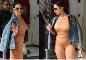 मलाइका अरोड़ा स्किन कलर की बेहद टाइट ड्रेस, जैकेट और गॉगल आई नज़र