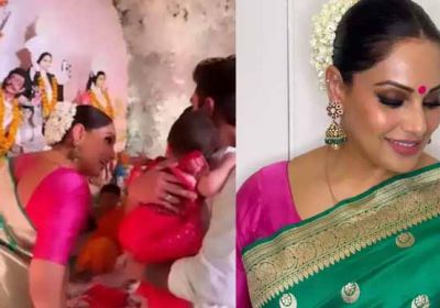 बिपाशा बसु और करण सिंह ग्रोवर बेटी देवी के साथ की दुर्गा पूजा