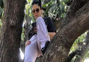 पेड़ पर चढ़कर मोबाइल चलाती दिखी सनी