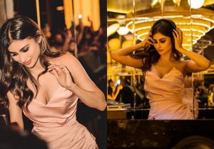 पीच साटिन शॉर्ट ड्रेस में दिखा मौनी रॉय का स्टाइलिश लुक
