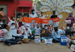 बृजमोहन निवास के बाहर धरने पर बैठे युवक कांग्रेसी, बयान पर जताई नाराजगी
