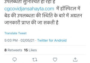 3 May, 2021 11:15 AM IST | SAMIKSHASAGAR.COMरायपुर रायपुर में कोविड मरीजों को अस्पतालों में सभी प्रकार के बेड पर्याप्त संख्या में उपलब्ध...