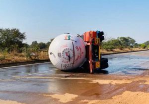 राष्ट्रीय राजमार्ग 53 में गैस टैंकर पलटा अनियंत्रित होकर, मार्ग सील