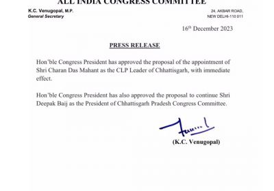 राष्ट्रीय अध्यक्ष मल्लिकार्जुन खडग़े ने डॉ. चरणदास महंत को बनाया नेता प्रतिपक्ष
