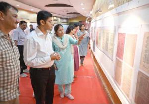 अंतर्राष्ट्रीय अभिलेखागार सप्ताह में प्रदर्शित ऐतिहासिक दस्तावेजों को निहार रहे लोग