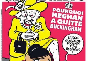 चार्ली हेब्दो के कार्टून पर फिर बवाल, प्रिंस हैरी की पत्नी को घुटने से दबाए दिखीं ब्रिटिश महारानी