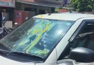 कर्नाटक में कांग्रेस कार्यकर्ताओं ने पार्टी के अध्यक्ष सी डी गंगाधर की कार पर पर फेंके अंडे