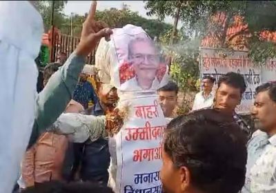 नीमच में कांग्रेस प्रत्याशी को बाहरी बता कर जलाया गया पुतला, उठाई यह मांग