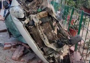 ताजमहल के पास 12 पिलर तोड़ते हुए पेड़ से टकराकर पलटी कार, बाल-बाल बचे सवार