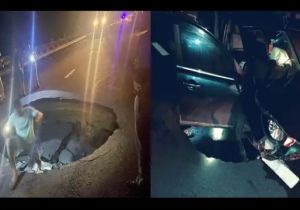 पूर्वांचल एक्सप्रेस वे नहीं झेल सका पहली 12 घंटे की बरसात, 15 फीट धंसी सड़क में फंसी कार