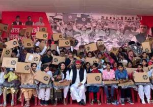 अखिलेश यादव ने छात्र-छात्राओं को बांटे लैपटॉप, BJP से पूछा- साढ़े चार साल से कौन सी टैबलेट दे रहे आप