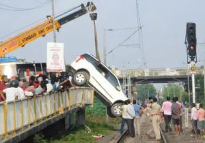 बेकाबू होकर पुल की रेलिंग तोड़ी, रेलवे ट्रैक के ऊपर लटकने लगी कार