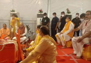 विंध्य कॉरिडोर का शिलान्यास: भूमि पूजन कर रहे गृह मंत्री अमित शाह, साथ में CM योगी