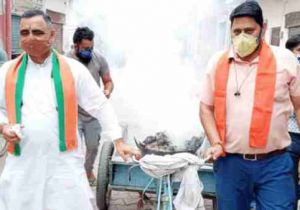 ठेले पर हवन का धुआं लेकर शंख बजाते हुए मेरठ की गलियों में घूमे भाजपा नेता, कहा- भागेगा कोरोना