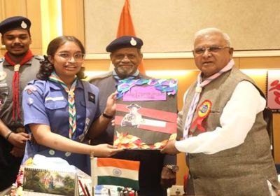 राज्यपाल पटेल को भारत स्काउट्स एवं गाइड्स का बैज और स्कार्फ पहनाया