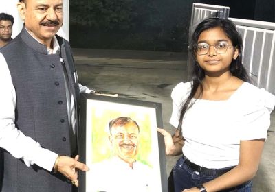 स्कूल शिक्षा मंत्री सिंह को बाल चित्रकार ने भेंट किया उनका चित्र