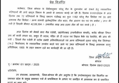 9 Jan, 2025 08:01 PM IST | SAMIKSHASAGAR.COMभोपाल कलेक्टर कौशलेन्द्र विक्रम सिंह के निर्देशानुसार घरेलू गैस सिलेण्डरों के दुरुपयोग को रोकने हेतु खाद्य...