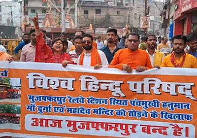 मुजफ्फरपुर में मंदिर को तोड़े जाने के विरोध में हजारों की संख्या में हिंदूवादी संगठनों के कार्यकर्ता सड़कों पर