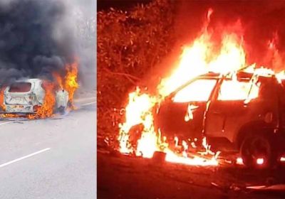 शॉर्ट सर्किट से इंजन में हुआ ब्लास्ट, परिवार सुरक्षित बाहर निकल आया, भीषण आग में पूरी कार जल गई