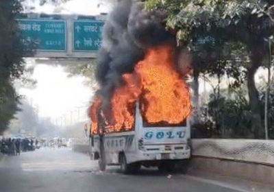इंदौर में वाहन टकराने के बाद शुक्ला ब्रदर्स की बस में आग, यात्री सुरक्षित, फायर ब्रिगेड ने पाया काबू