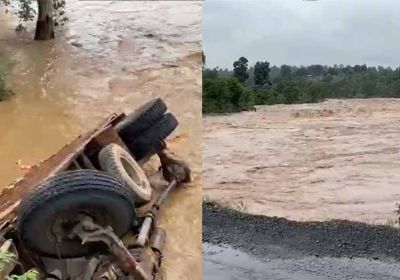 बलरामपुर जिले में जोरदार बारिश, उफनती नदी में अनियंत्रित होकर पलटी ट्रक, बाल-बाल बचे 5 लोग