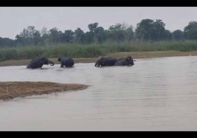 चार दंतैल हाथियों का एक दल तलाब में अठखेलियां करते आया नजर