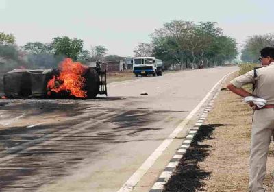 नेशनल हाईवे 30 पर डीजल टैंकर पलटा, लगी आग, ड्राइवर और हेल्पर घायल
