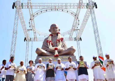 मल्लिकार्जुन खड़गे ने सुवर्ण विधान सौध के परिसर में महात्मा गांधी की 25 फीट ऊंची प्रतिमा का अनावरण किया