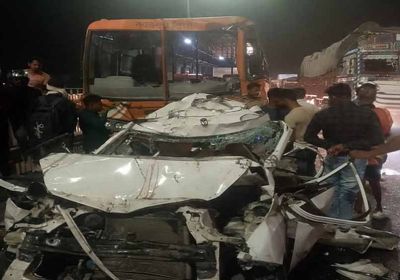 आगरा-मथुरा हाईवे पर भीषण सड़क हादसा, मेटाडोर-रोडवेज के बीच पिस गई कार, दो युवकों की मौत