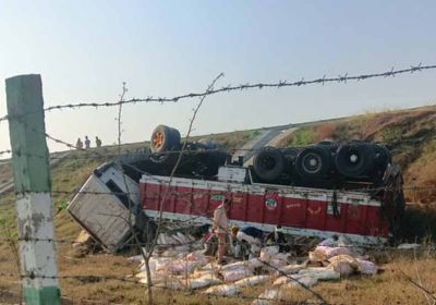 पूर्वांचल एक्सप्रेस-वे पर पलटा शराब का ट्रक