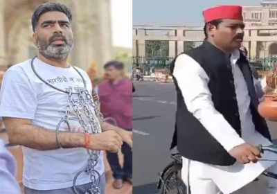 विधानसभा के बाहर समाजवादी पार्टी के विधायक ने बेड़िया पहन किए प्रर्दशन