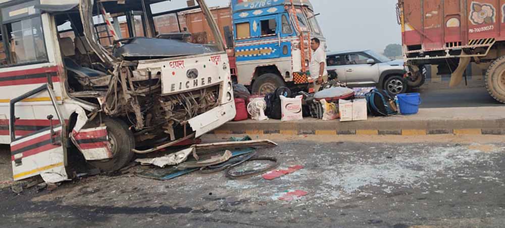छपरा में तेज रफ्तार ट्रक ने पुलिसकर्मियों की बस को टक्कर मार दी। हादसे में 17 पुलिसकर्मी घायल हो गए। इन्हें अस्पताल में भर्ती करवाया गया है। बताया जा रहा है कि पीएम मोदी के कार्यक्रम की सुरक्षा में तैनात किए गए यह सभी पुलिसकर्मी डेहरी ऑन सोन से सीवान जा रहे थे। छपरा में इनकी बस को तेज रफ्तार ट्रक ने टक्कर मार दी। हादसे में बस चालक को गंभीर रूप से घायल हो गए। उसे बेहतर इलाज के लिए हायर सेंटर रेफर कर दिया गया है। बस चालक की पहचान छपरा के गौतम प्रसाद निवासी रमेश कुमार (35 वर्ष) के रूप में हुई है।