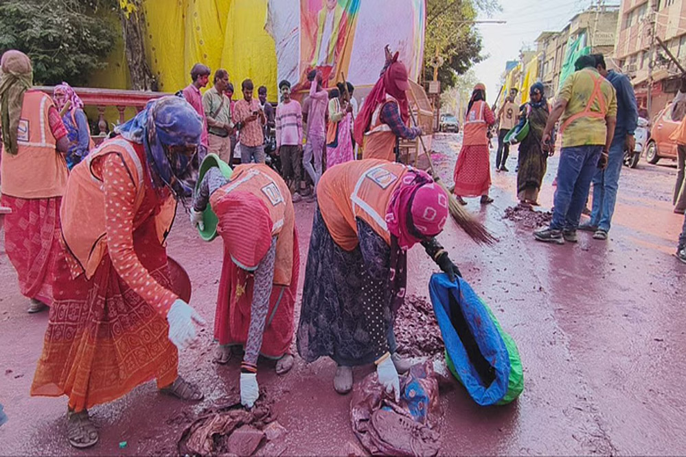 इंदौर में जहां-जहां से गेर गुजरी, वहां रंग और कीचड़ हो गया था। गेर निकलने के बाद नगर निगम के अमले ने आज फिर से यहां की सफाई को चुनौती के रूप में लिया। नगर निगम के अपर आयुक्त अभिलाष मिश्रा की देखरेख में मुख्य स्वास्थ्य अधिकारी डॉ. अखिलेश उपाध्याय द्वारा राजवाड़ा क्षेत्र और आसपास की गलियों में सफाई का अभियान प्रारंभ किया गया। मौके पर नगर निगम आयुक्त शिवम वर्मा और अपर आयुक्त रोहित सिसोनिया भी सफाई कर्मियों का हौसला बढ़ाने पहुंचे। नगर निगम के सफाई कर्मी वाकई सम्मान के पात्र हैं कि उन्होंने राजबाड़ा क्षेत्र की सफाई मात्र 38 मिनट में पूरी कर ली।