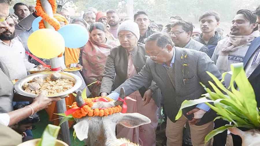 बलरामपुर रामानुजगंज ग्राम पंचायत देवीगंज में संचालित श्री श्याम श्यामा गौशाला में शेड निर्माण कार्य के शिलान्यास, सामुदायिक गाय शेड लोकार्पण कार्यक्रम व गौ पूजन कार्यक्रम में कृषि मंत्री राम विचार नेताम, पत्नी जिला पंचायत सभापति पुष्पा नेताम के साथ पहुंचकर विधि विधान से पूजा अर्चना किया एवं गौवंश को गुड़, चारा खिलाया। इस अवसर पर उन्होंने सामुदायिक भवन एवं गोदाम निर्माण की घोषणा भी की। नेताम सपत्नी गौशाला परिसर में वृक्षारोपण भी किया।