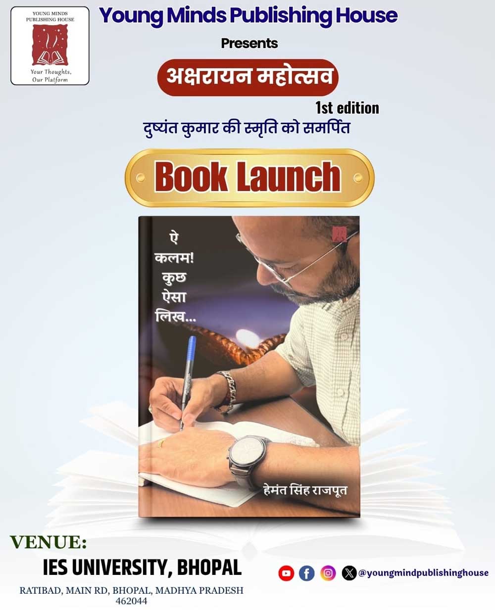 इस आयोजन में उभरते लेखक एवं कवि हेमंत सिंह राजपूत द्वारा अपनी पुस्तक ऐ कलम कुछ ऐसा लिख का विमोचन किया जा रहा है जोकि उनकी काव्य रचनाओं का संग्रह है। 4 नवंबर के बाद यह पुस्तक ऑनलाइन उपलब्ध होगी।