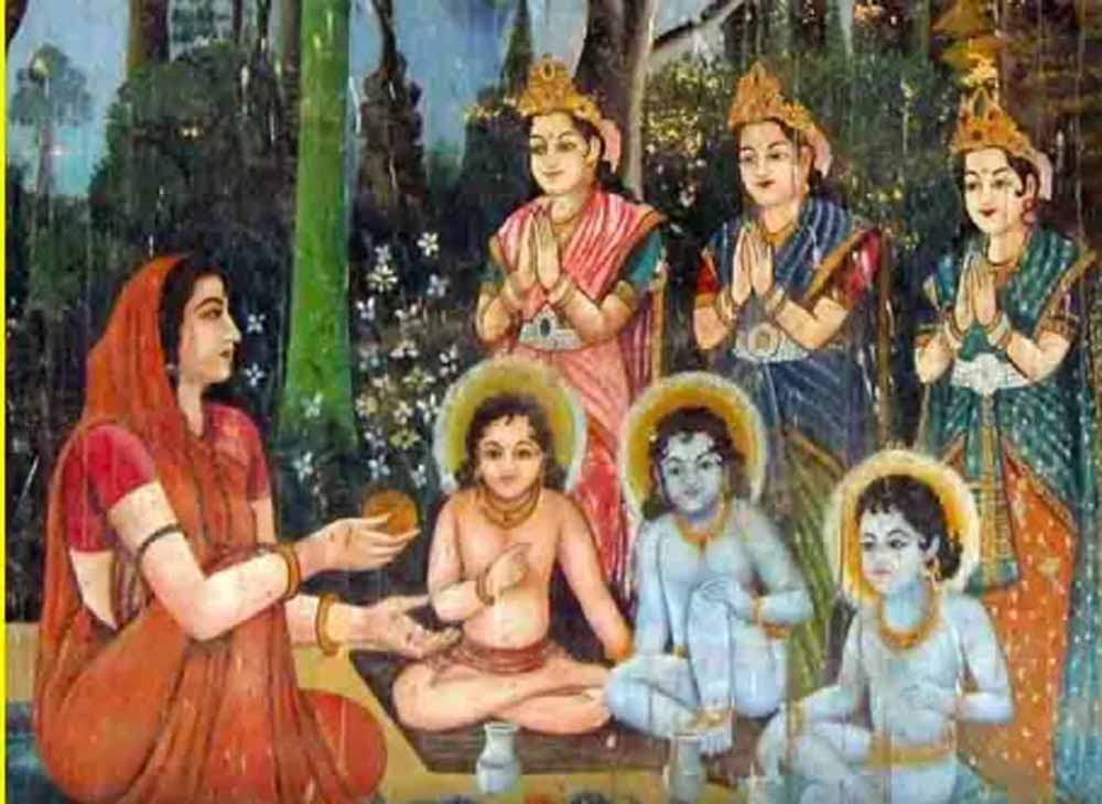 अपनी पत्नियों का आग्रह मानकर वे तीनों ऋषि पत्नी अनुसूया के सतीत्व की परीक्षा लेने के लिए पृथ्वी लोक में उनके आश्रम में पहुंच गए। उन्होंने उनकी कुटिया के बाहर खड़े होकर भिक्षा के लिए पुकार लगाई। उनकी पुकार सुनकर अनुसूया बाहर आईं। उन्होंने अतिथियों का स्वागत-सत्कार किया और उनकी इच्छा पूछी। उन्होंने कहा कि वे भूखे हैं और भोजन करना चाहते हैं। लेकिन हमारा यह नियम है कि हमें भिक्षा देने वाला निर्वस्त्र होकर हमें भोजन करवाता है, तभी हम भोजन करते हैं। यह सुनकर अनुसूया ने तीनों से कहा कि जैसी आपकी इच्छा। अनुसूया ने अपने हाथ में जल लिया और अपने पति को स्मरण करते हुए मन-ही-मन कहा कि अगर मेरा पतिव्रत धर्म अखंड है तो ये तीनों अतिथि इसी क्षण शिशु बन जाएं। यह कहकर उन्होंने तीनों अतिथियों पर जल छिड़क दिया। वे तीनों ही तत्काल नवजात शिशु बन गए। तब अनुसूया ने मातृ भाव से तीनों को भोजन कराया। भोजन के उपरांत पास ही पालने में तीनों शिशुओं को सुला दिया।