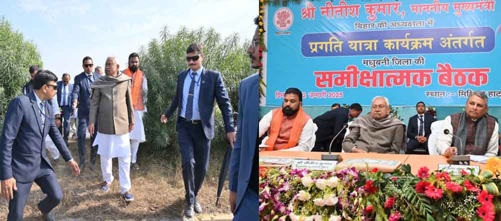 इस दौरान मुख्यमंत्री ने कहा कि हम दो बार गलती से इधर से उधर चले गए थे। हमारा संबंधवर्ष 1995 से है। श्रद्धेय अटल बिहारी वाजपेयी जी की सरकार में हम केंद्र में मंत्री थे। वे मुझेबहुत मानते थे। उन्होंने ही मुझे बिहार का मुख्यमंत्री बनाया। हम सब मिलकर बिहार केविकास के लिए काम करते रहेंगे, बिहार को आगे बढ़ाएंगे।समीक्षा बैठक में उप मुख्यमंत्री श्री सम्राट चौधरी, जल संसाधन सह संसदीय कार्य मंत्रीश्री विजय कुमार चौधरी, खाद्य एवं उपभोक्ता संरक्षण मंत्री सह मधुबनी जिले की प्रभारी मंत्रीश्रीमती लेशी सिंह, उद्योग सह पर्यटन मंत्री श्री नीतीश मिश्रा, परिवहन मंत्री श्रीमती शीलाकुमारी, सांसद श्री संजय कुमार झा, सांसद श्री रामप्रीत मंडल, सांसद श्री अशोक कुमारयादव, विधायक श्री विनोद नारायण झा, विधायक श्री रामप्रीत पासवान, विधायक श्री अरुणशंकर प्रसाद, विधायक श्री सुधांशु शेखर, विधायक श्री हरिभूषण ठाकुर बचौल, विधायक श्रीमतीमीना कुमारी, विधायक श्री समीर कुमार महासेठ, विधान पार्षद श्री घनश्याम ठाकुर, जिलापरिषद् अध्यक्ष श्रीमती बिंदु गुलाब यादव, महापौर श्री अरुण राय, अन्य जनप्रतिनिधिगण, मुख्यसचिव श्री अमृत लाल मीणा, पुलिस महानिदेशक श्री विनय कुमार, मुख्यमंत्री के प्रधान सचिवडॉ0 एस0 सिद्धार्थ, मुख्यमंत्री के विशेष कार्य पदाधिकारी श्री गोपाल सिंह, विभिन्न विभागों केअपर मुख्य सचिव/प्रधान सचिव/सचिव, दरभंगा प्रमंडल के आयुक्त श्री मनीष कुमार, दरभंगाप्रक्षेत्र की पुलिस उप महानिरीक्षक श्रीमती स्वपना गौतम मेश्राम, मधुबनी के जिलाधिकारी श्रीअरविन्द कुमार वर्मा एवं मधुबनी के पुलिस अधीक्षक श्री योगेंद्र कुमार सहित अन्य वरीयअधिकारी उपस्थित थे। इसके लिए आपसबको बधाई एवं धन्यवाद देता हूँ। समीक्षा बैठक में मधुबनी जिला के जिलाधिकारी श्री अरविंद कुमार वर्मा ने प्रतीक चिह्नऔर हरित पौधा भेंटकर मुख्यमंत्री का स्वागत किया।मुख्यमंत्री ने समीक्षा बैठक के पूर्व मिथिला हाट का निरीक्षण किया और इसकी प्रशंसा की।