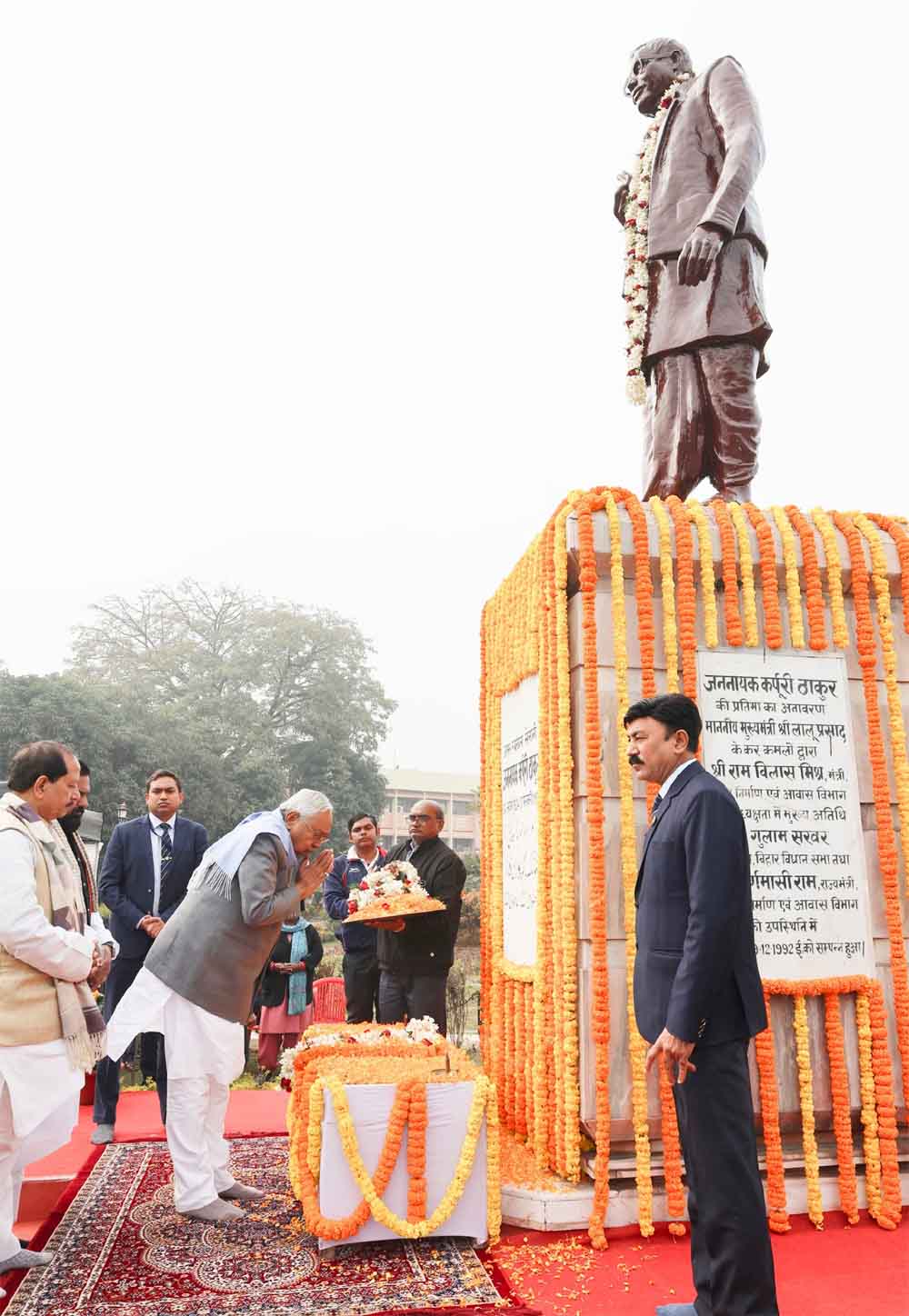 भारत रत्न जननायक कर्पूरी ठाकुर जी की 101वीं जयंती के अवसर पर बिहार विधान मंडल परिसर में आयोजित राजकीय समारोह में मुख्यमंत्री श्री नीतीशकुमार ने उनकी आदमकद प्रतिमा पर पुष्प अर्पित कर भावभीनी श्रद्धांजलि दी।