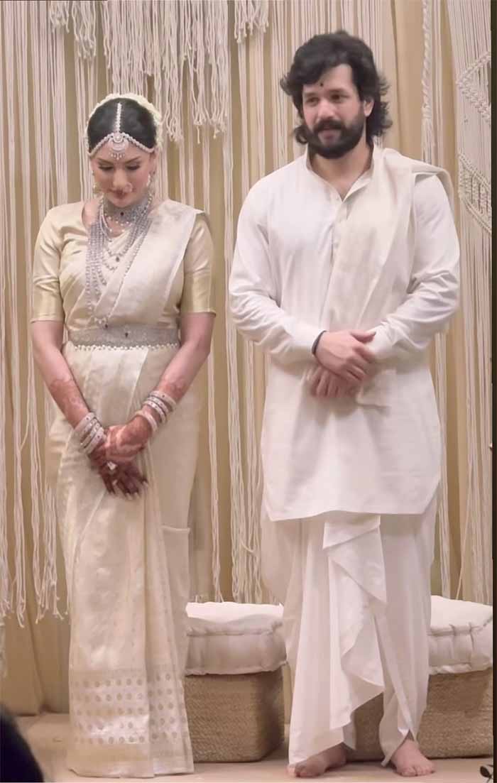 साउथ सुपरस्टार नागार्जुन के घर फिर जश्न का माहौल है। नागार्जुन के छोटे बेटे और नागा चैतन्य के भाई अखिल अक्किनेनी शादी के बंधन में बंध गए हैं। उन्होंने 6 जून को हैदराबाद में अपनी गर्लफ्रेंड जैनब रावजी से शादी कर ली है, जिसकी तस्वीरें सोशल मीडिया पर तेजी से वायरल हो रही हैं। हालांकि, अखिल अक्किनेनी ने अभी तक आधिकारिक तौर पर शादी की पहली तस्वीरें शेयर नहीं की हैं, लेकिन उनकी शादी फंक्शन की कई इंटरनेट पर वायरल हो गईं। वायरल हो रही फोटोज में अखिल को ट्रेडिशनल व्हाइट आउटफिट में देखा जा सकता है, जबकि जैनब आइवरी की कढ़ाई वाली एक ऑफ-व्हाइट साड़ी में बेहद खूबसूरत लग रही हैं। इसके साथ ही उन्होंने सुंदर डिजाइन वाले हीरे के आभूषणों भी पहने हैं और बालों को व्हाइट फूलों से सजाया है। ओवरऑल लुक में दुल्हन बनी जैनब बेहद प्यारी लग रही हैं।   इसके अलावा एक अन्य फोटो में नागार्जुन अपने बेटे के साथ शादी की रस्म निभाते नजर आ रहे हैं। अखिल की शादी में नागार्जुन के बड़े बेटे नागा चैतन्य और उनकी पत्नी शोभिता धुलिपाला भी मौजूद रहे।