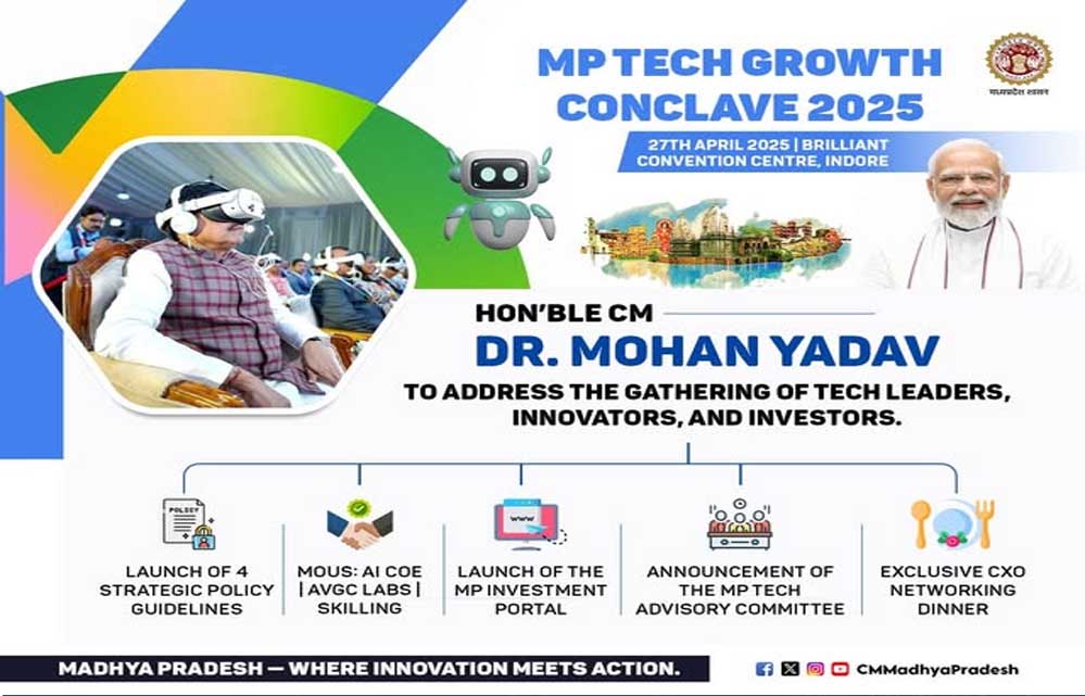 मध्यप्रदेश को टेक्नोलॉजी और डिजिटल नवाचार का केन्द्र बनाने के उद्देश्य से आयोजित ‘एमपी टेक ग्रोथ कॉन्क्लेव 2025’ का शुभारंभ मुख्यमंत्री डॉ. मोहन यादव 27 अप्रैल को इंदौर के ‘ब्रिलिएंट कन्वेंशन सेंटर’ में करेंगे। मुख्यमंत्री डॉ. यादव ने उम्मीद जताई है कि कॉन्क्लेव देश-दुनिया के टेक दिग्गजों के लिए निवेश का स्वर्णिम अवसर सिद्ध होगा। राज्य के विज्ञान एवं प्रौद्योगिकी विभाग का ये कॉन्क्लेव आयोजन जीआईएस-भोपाल में आए निवेश प्रस्तावों को मूर्त रूप देने का महत्वपूर्ण प्रयास है।