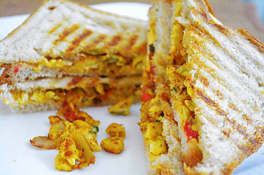 ब्रेड स्लाइस पर मक्खन लगाएं। एक स्लाइस पर अंडा भुर्जी भरें और दूसरी स्लाइस से ढक दें। आप चाहें तो इसमें चटनी भी लगा सकते हैं।