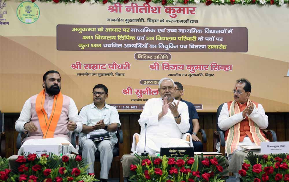 मुख्यमंत्री नीतीश कुमार ने आज मुख्यमंत्री सचिवालय स्थित 'संवाद' में अनुकंपा के आधार पर माध्यमिक एवं उच्च माध्यमिक विद्यालयों में 4835 विद्यालय लिपिक एवं 518 विद्यालय परिचारी के पदों पर चयनित कुल 5353 अभ्यर्थियों को नियुक्ति पत्र प्रदान किया। इस दौरान मुख्यमंत्री ने सांकेतिक रूप से मणि कुमारी,अमित गौरव, दिव्या राज, किरण कुमारी गुप्ता एवं तूबा अशरफ को नियुक्ति पत्र प्रदान किया। इस दौरान मुख्यमंत्री ने कहा कि सभी नवनियुक्त कर्मियों को मेरी हार्दिक बधाई एवं शुभकामनाएं है। मुझे विश्वास है कि सभी नवनियुक्त कर्मी पूरी ईमानदारी और निष्ठा के साथ अपने कर्तव्यों का निर्वहन करेंगे।