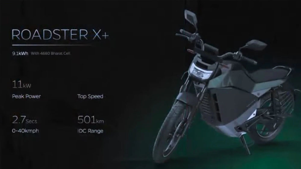 Roadster X Plus को कंपनी ने दो बैटरी पैक (4.5kWh और 9.1kWh) के साथ पेश किया है. इसमें कंपनी ने अपना खुद का भारत सेल बैटरी पैक दिया है. जिसके बारे में कंपनी का कहना है कि इसका मोटर 11KW का पावर जेनरेट करता है और इसकी टॉप स्पीड 125 किमी/घंटा है. ये मोटरसाइकिल महज 2.7 सेकंड में ही 0 से 40 किमी/घंटा की रफ्तार पकड़ने में सक्षम है. कंपनी का दावा है कि इसका 9.1Kwh बैटरी पैक वेरिएंट सिंगल चार्ज में 501 किमी तक की ड्राइविंग रेंज देने में सक्षम है.