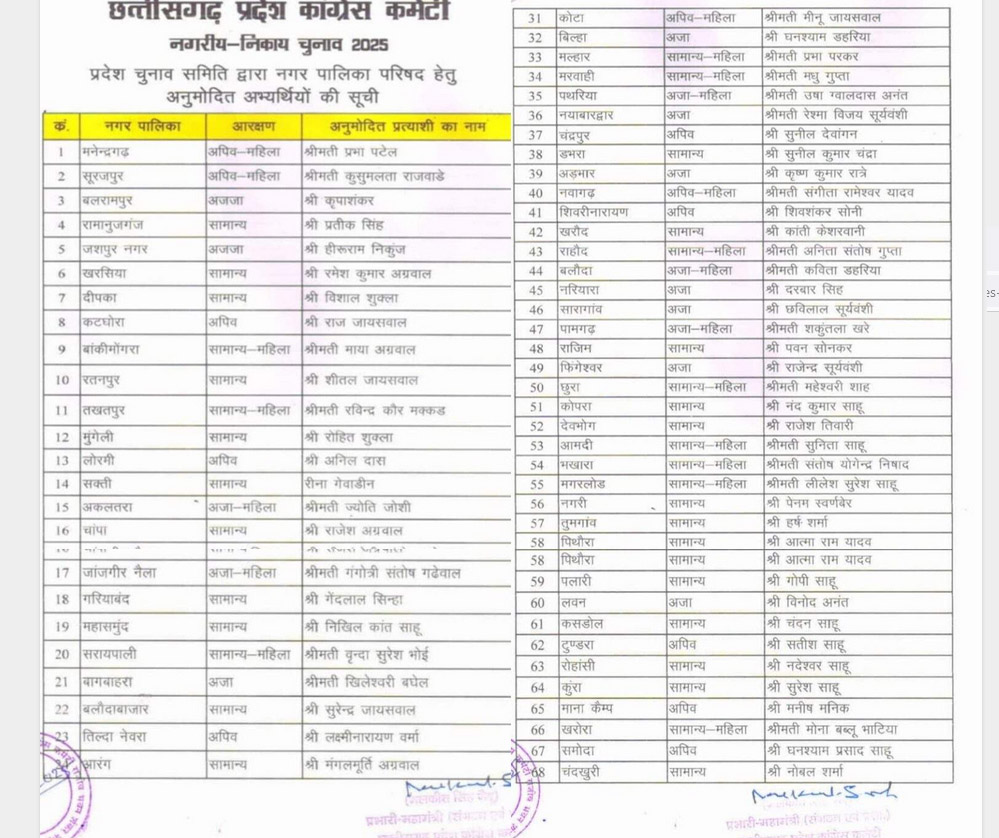 कांग्रेस नेताओं ने बताया कि पार्टी ने निवर्तमान महापौर डॉक्टर अजय तिर्की को अंबिकापुर से, पूर्व विधायक डॉक्टर विनय जायसवाल को चिरमिरी से, दीप्ति प्रमोद दुबे को रायपुर से, दो बार की पूर्व पार्षद प्रेमलता पोषण साहू को दुर्ग से, प्रमोद नायक को बिलासपुर से और ऊषा तिवारी को कोरबा से चुनाव मैदान में उतारा है।