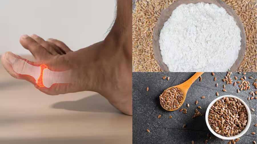 अलसी में ओमेगा-थ्री फैटी एसिड और एंटीऑक्सीडेंट्स की अच्छी मात्रा पाई जाती है, जो सूजन को कम करते हैं और यूरिक एसिड के स्तर को कंट्रोल करते हैं। ऐसे में गेहूं के आटे में 1-2 चम्मच अलसी का पाउडर मिलाकर इस्तेमाल करें।