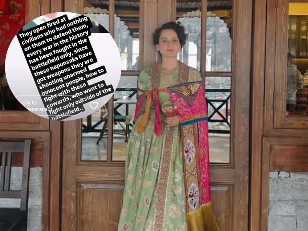 कंगना रनौत ने अपने इंस्टाग्राम पर दो पोस्ट शेयर किए। पहली पोस्ट में हमले की तस्वीर है। इस तस्वीर के साथ कंगना ने लिखा- "आतंकवाद का धर्म होता है और पीड़ितों का भी।" कंगना ने दूसरे पोस्ट में पीड़ितों का वीडियो शेयर किया है। इसे शेयर करने के साथ कंगना ने लिखा- "इन लोगों ने आम नागरिकों पर गोलियां बरसाईं जिनके पास खुद को बचाने के लिए कुछ भी नहीं था। इतिहास में हर लड़ाई जंग के मैदान में लड़ी गई है, लेकिन जब से इन नपुंसकों को हथियार मिले हैं ये मासूम लोगों पर गोलियां चला रहे हैं, इन डरपोक लोगों से कैसे लड़ा जाए जो केवल जंग के मैदान के बाहर लड़ना चाहते हैं।"